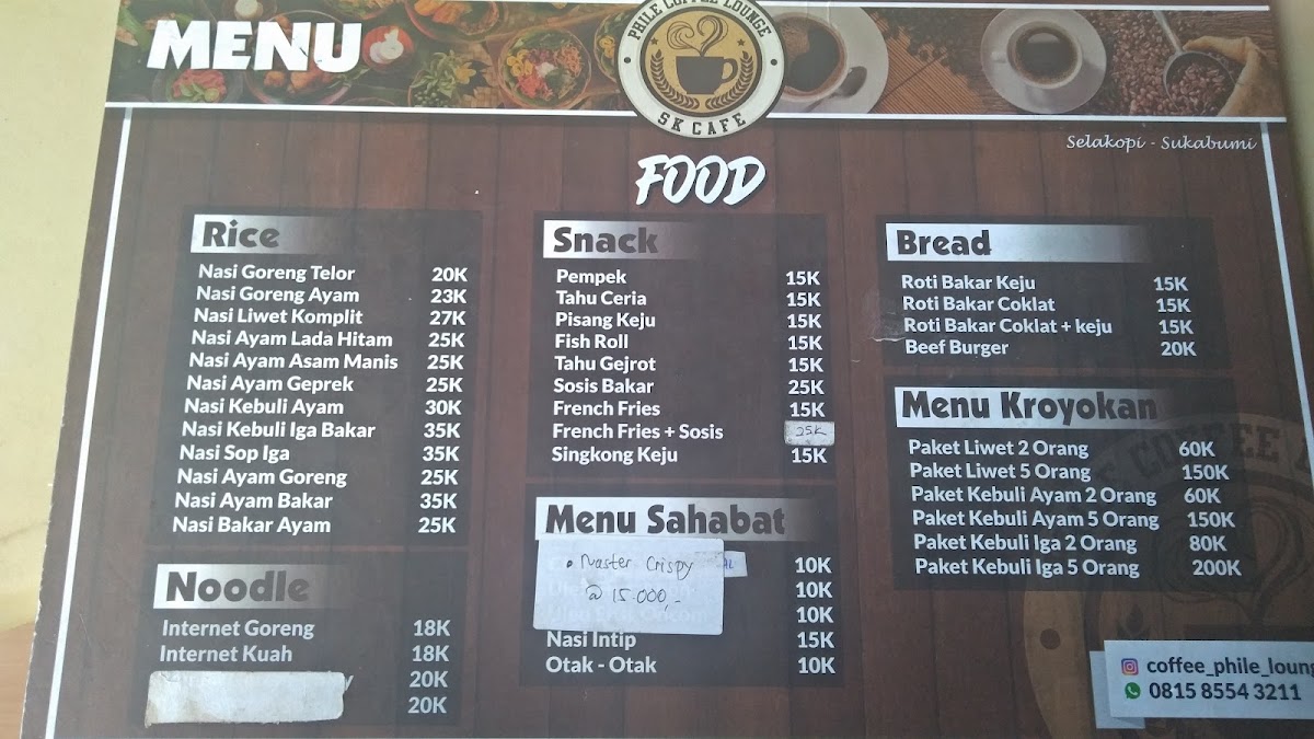 The menu boasts a delightful array of beverages to suit every palate. Indulge in their delicious milkshakes, priced at IDR 25,000, featuring flavors like chocolate, strawberry, and tiramisu. For a refreshing treat, try the juices, such as dragon fruit and mango, starting at IDR 15,000. Coffee lovers will enjoy the Phile sahabat series, offering various iced coffee and chocolate drinks for just IDR 12,000.